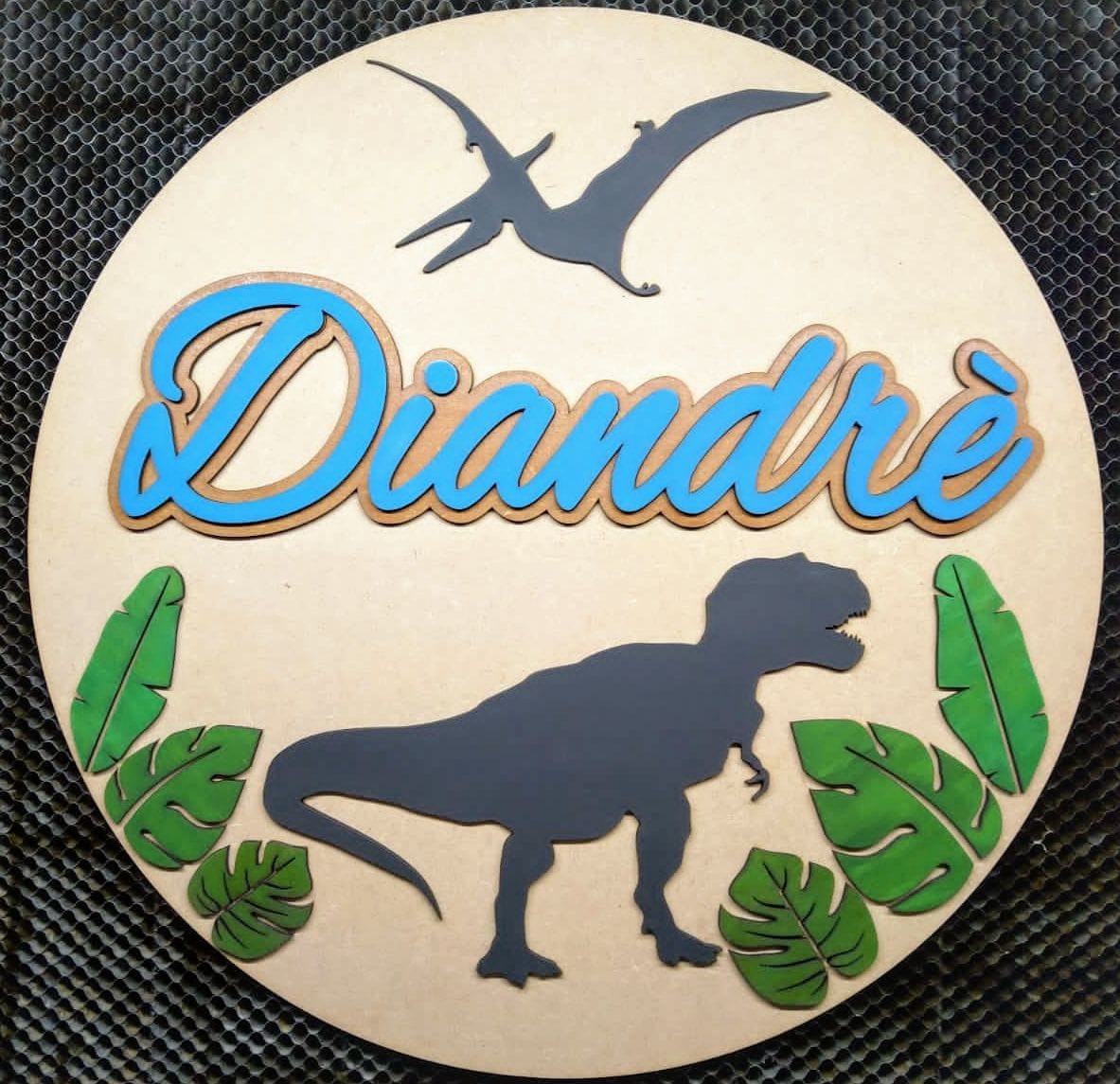 The leaves are cut from hand painted MDF/Supawood to add a beautifully detailed element to this great design. Both the dinosaurs are painted a solid black
